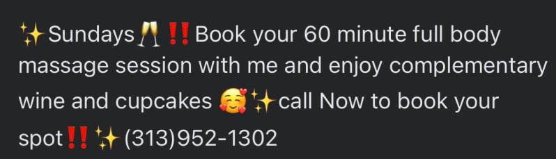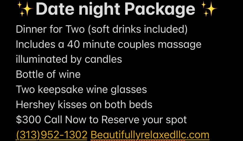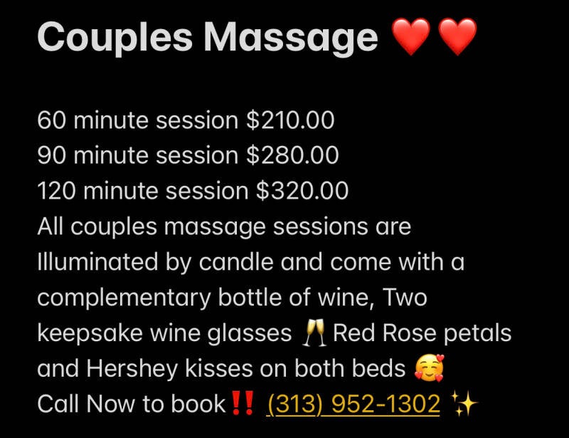 ⭐️Mobile Massage Therapy ‼️⭐️Specializing in Relaxation‼️⭐️We offer several different massage sessions including Hot stone massage, Water massage, Cannabis Sativa Seed oil massage, CBD oil massage Stress relief Therapeutic massage, Deep Tissue massage CRYO massage, Weight loss Massage, Sports massage Aromatherapy massage as well as Facials and body scrubs 🤩 We come to you!🤩 There's an additional $25 Travel fee (within limits) may be extra depending on your location. Let us service you Today! (313) 952-1302 Book Now‼️ Don't forget to try our Sneaky Freaky Adult candle collection‼️😜 ✨Try one Today‼️ Just light , let it melt and Enjoy 🥰✨WARNING: Increases sexual stimulation‼️‼️ May cause Extreme Pleasure‼️‼️